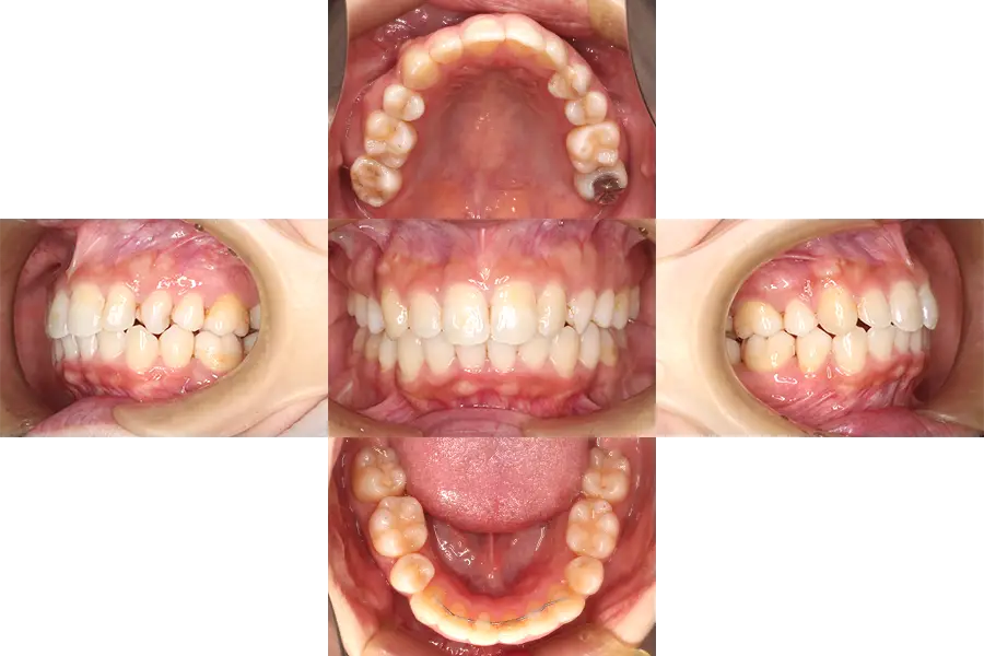 - 過蓋咬合、重度の凸凹、大臼歯部ハサミ状咬合(すれ違い咬合)、小臼歯埋伏、左上犬歯の先天性欠損