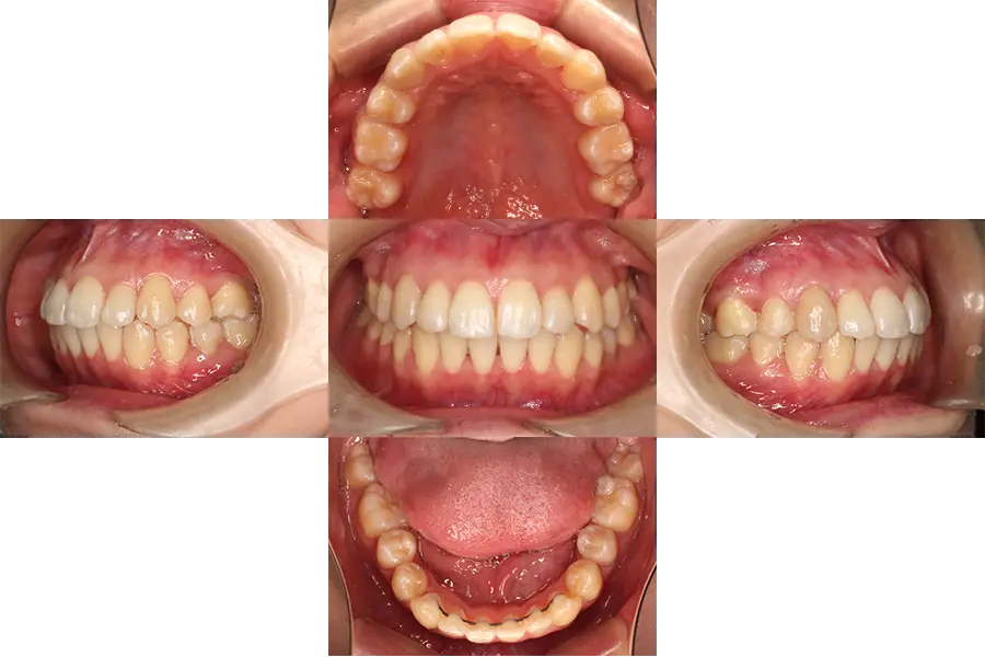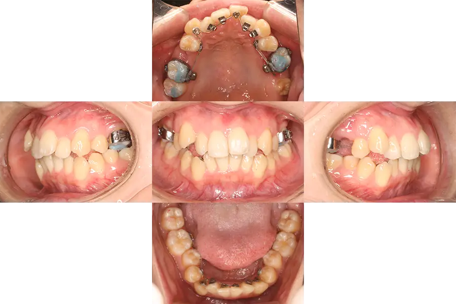 著しい上顎前突と上下顎に軽度~中等度の凸凹が認められたため、上下顎両側小臼歯計4本を抜歯、上下にリンガルブラケット、上顎に矯正用アンカーI-station、下顎にミニスクリューを使用して、上顎前歯を舌側に下げると共に臼歯部の前後的側方的なズレを治し、歯並びおよび全顎的な咬合を改善した。